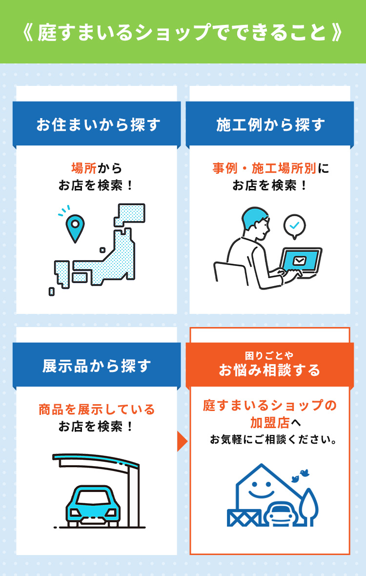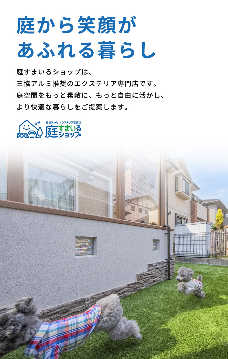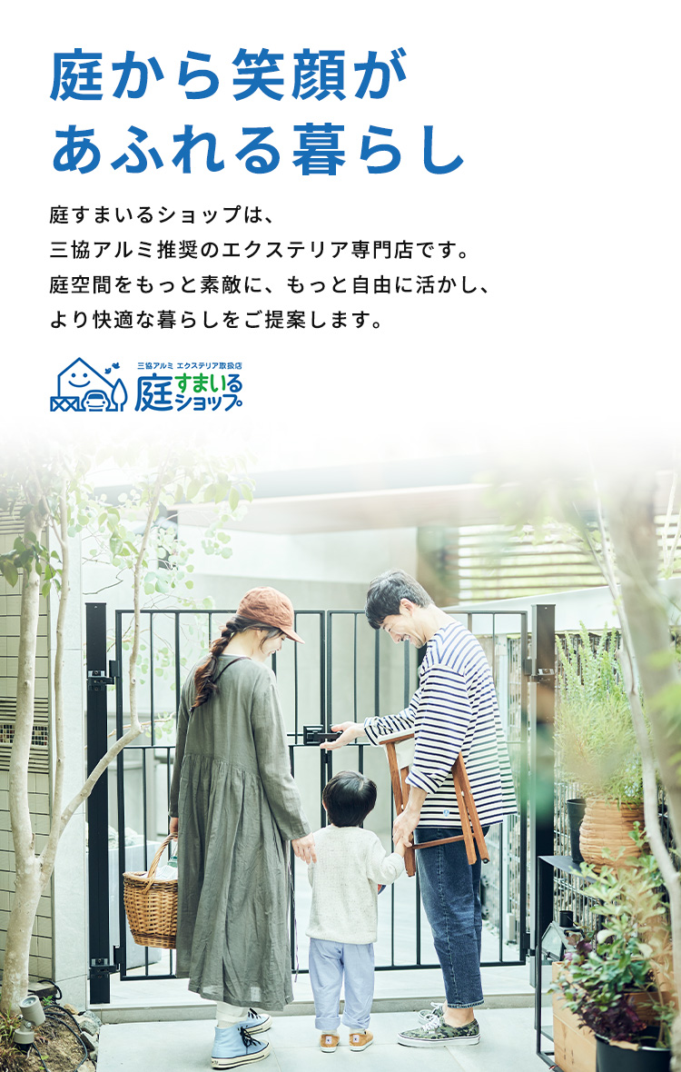 「庭すまいるショップ」は、お庭の困りごとやお悩みを解決し、お庭の暮らしをサポートする三協アルミ推奨店です。庭に広がる空間をもっとステキに、もっと自由に活用し、より快適な庭空間を提供します。